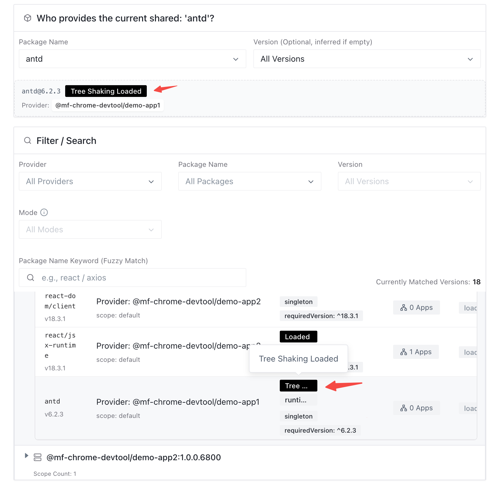 Tree Shaking Loadedmeans Tree Shaking is effective and the trimmed artifact is loaded;Loadedmeans it fell back to loading the full bundle;Tree Shaking Loadingmeans it’s loading via the Tree Shaking path.
